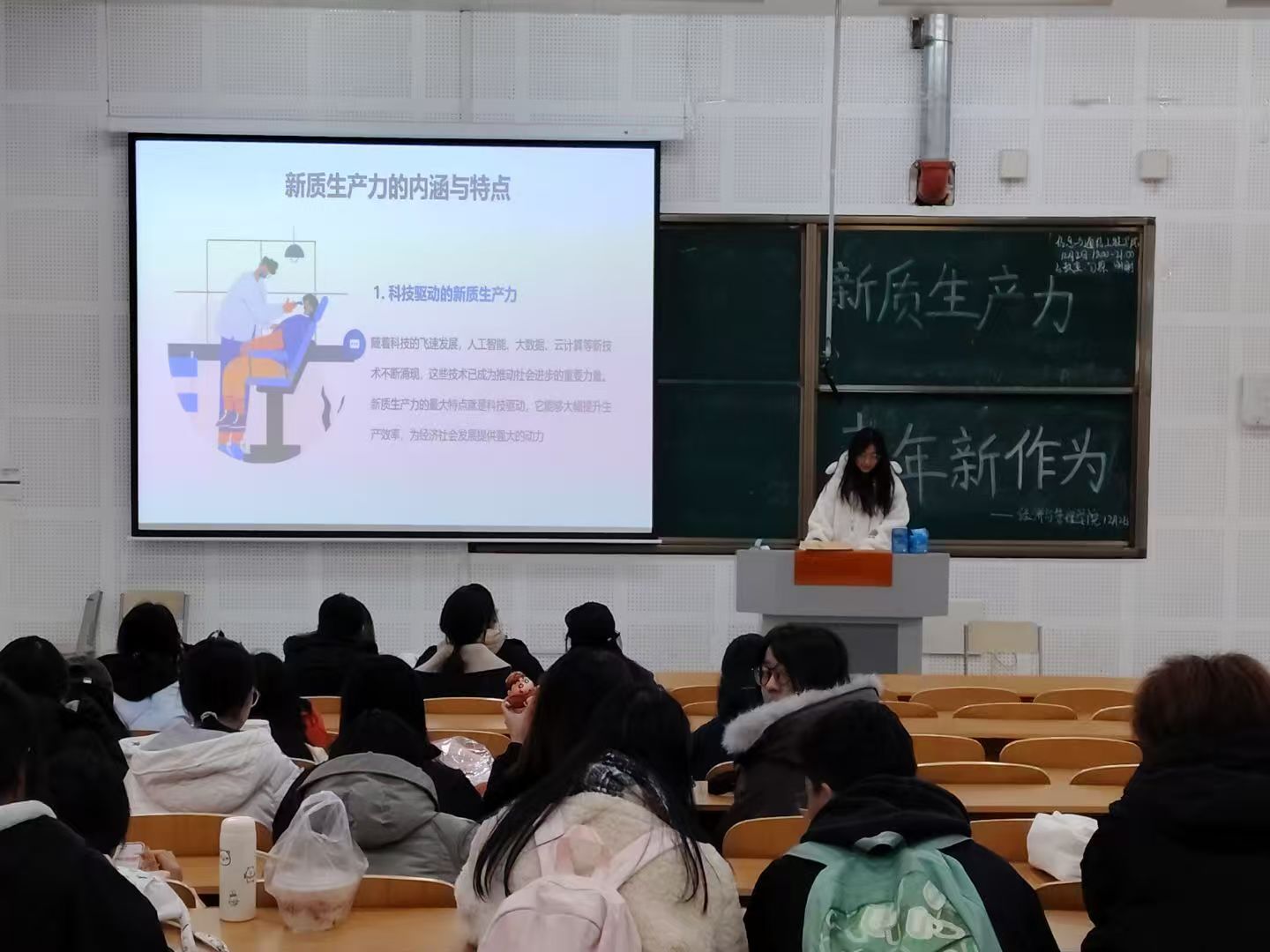 活动伊始,学生代表通过讲解PPT的形式,从“智能工厂替代传统车间”“新能源产业崛起”等案例切入,阐述新质生产力“科技驱动,绿色低碳,数据赋能”的核心特点,并点明青年是推动新质生产力发展的先锋力量。随后,学生代表结合专业实际组织研讨“校园场景中的新质生产力”,解析新质生产力的发展趋势,帮助学生深化认知。最后,在宣讲结束后,现场学生反响热烈。同学们纷纷表示,此次宣讲使自己对新质生产力产生更深刻认识,将深耕专业知识,提升创新技能以实际行动融入新质生产力发展大局。