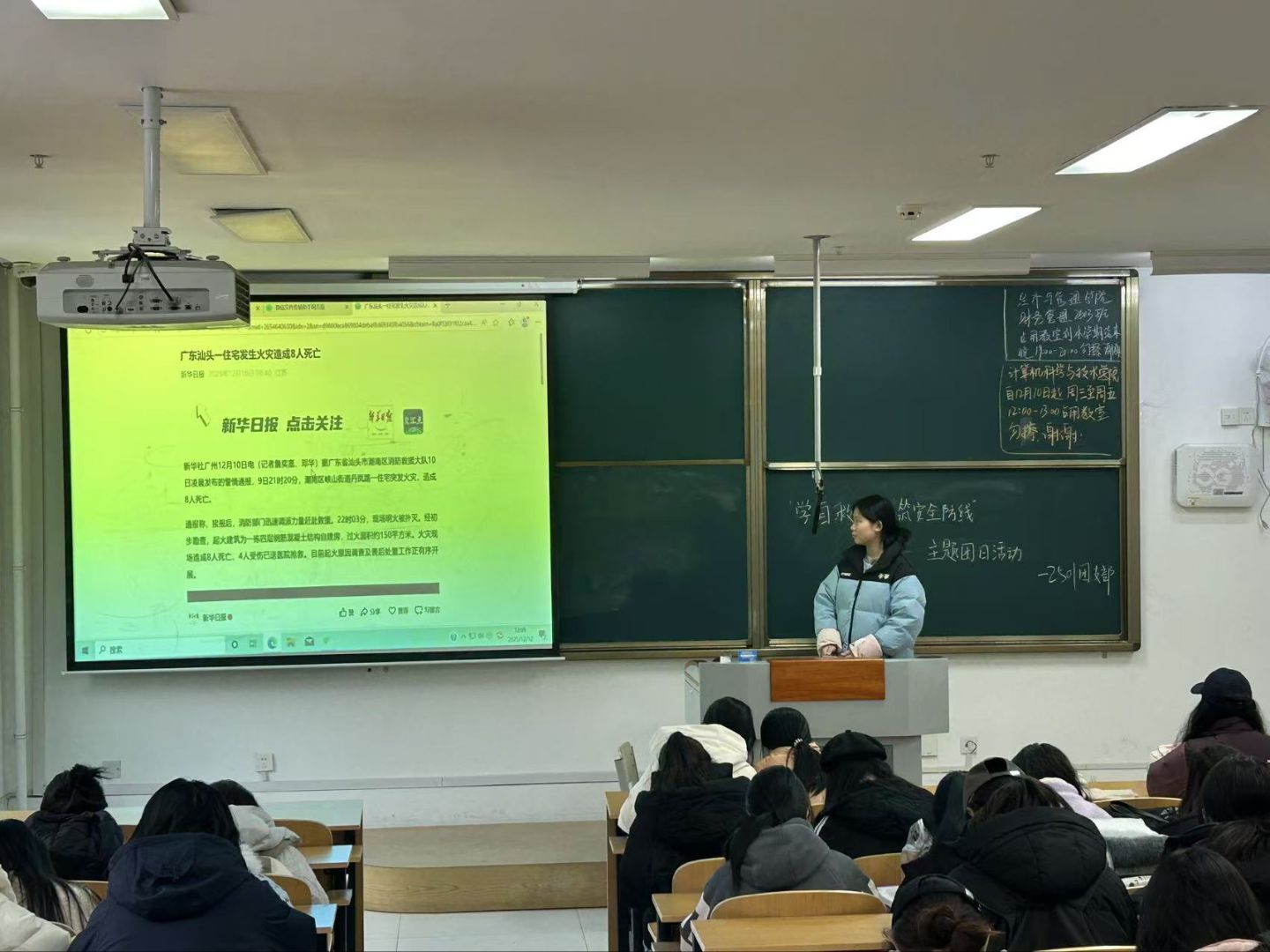 活动伊始,学生代表通过讲解PPT的形式,以真实的火灾案例与专业的消防知识,带领同学们认识火灾隐患的多样形式。从宿舍用电不当的潜在风险,到公共场所消防设施的使用方法,层层递进地展现火灾预防的重要性。随后,学生代表通过生动地讲解,将火灾发生时的逃生技巧、初期火灾的扑救方法等内容细致阐述。最后,同学们纷纷表示,在今后的学习生活中,将以严谨态度对待防火工作,主动排查身边安全隐患,把防火意识转化为日常行动,学习消防技能,提升自护能力,以青年之责任,在平安校园的建设中筑牢安全屏障。